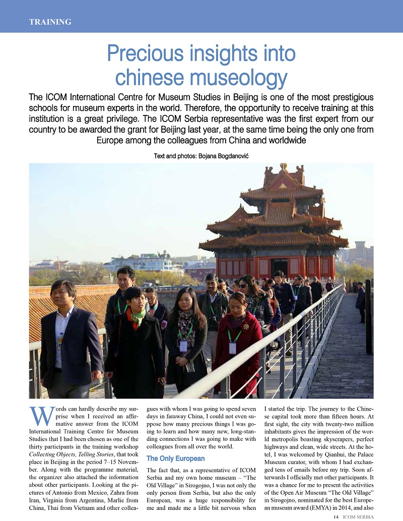 近期,培訓中心收到了來自第七期培訓班學員塞爾維亞“老村”露天博物館高級策展人Bojana Bogdanovic的反饋。她于2016年11月7日至11月15日來到北京參加國際博協培訓中心2016年秋季培訓班。培訓結束后,她將自己的所見所聞成文,并在塞爾維亞博協官方雜志公開發表。下文為部分節選內容。