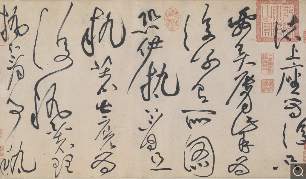 《諸上座帖》摘自北宋道元所著禪宗史書《景德傳燈錄》卷二十八“大法眼文益禪師語”。文益(八八五 — 九五八),五代時僧人,俗姓魯,余杭人。法眼宗創始人。帖中首書“上座”是對比丘中有德行者的尊稱。“諸上座”即指各位高僧。《諸上座帖》全篇七十九行,一氣呵成,筆法蒼勁老辣,氣勢雄偉,神完氣足。山谷晚年總結自己學習草書經歷道:“予學草書三十年,初以周越為師……晚得蘇才翁子美書……其后又得張長史、僧懷素、高閑墨跡,乃窺筆法之妙。”可以說懷素對黃庭堅的草書產生了重要影響,故《石渠寶笈》著錄此帖為“摹懷素”。但草法變幻無端,非一味摹學便能成就一代大家。孫承澤在《庚子銷夏記》中這樣評價:“山谷天分高,學力足,固非全取法于懷素者也。”