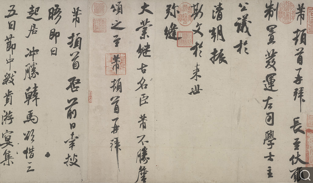 此卷系米芾三封書信合裝而成。第一封《長至帖》又名《公議帖》,是長至(即夏至)日寫給上司“制置發運左司學士”的節日祝頌之詞。第二封《韓馬帖》向親戚商借唐代名畫家韓幹所繪馬圖,以供節日宴集觀賞之用。第三封《新恩帖》則是致一位新任吏部侍郎的道賀信。據考證,三札均作于五十歲前后,人書俱老。其運筆沉著痛快,精妙入微;結字、布局姿態橫生,顧盼多情。堪稱作者傳世至精筆墨。