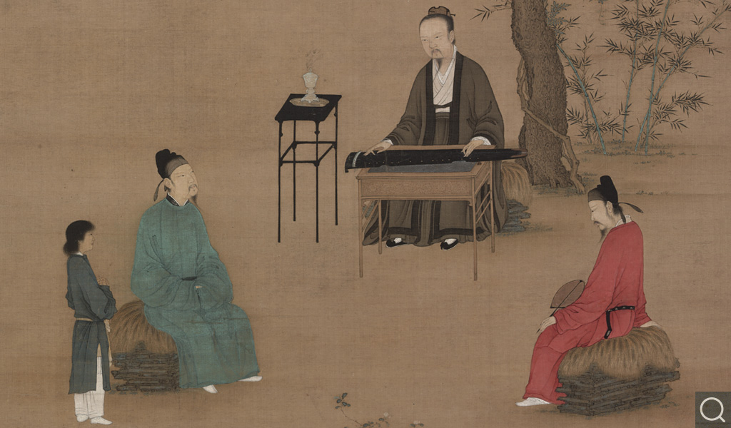 此幅《聽琴圖》為設色人物畫,描繪官僚貴族雅集聽琴的場景。主人公道冠玄袍坐于松前石墩上,雙目直視前方,凝神撫琴,前面坐墩上兩位紗帽官服的朝士對坐聆聽。作者以琴聲為主題,巧妙地用筆墨刻畫出“此時無聲勝有聲”的音樂意境。畫面背景簡潔,取景于盤繞著盛開的凌霄花的長松與數(shù)竿修竹,襯托出庭園高雅脫俗的環(huán)境。而幾案上香煙裊裊的薰爐,與玲瓏石上的古鼎和優(yōu)雅的琴聲一道營造出一種幽美清靜的氛圍。