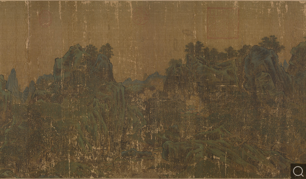 是圖所繪原為長江岸上群峰羅列,寺觀叢林,互相映帶。江水粼粼,風(fēng)帆出沒于其間,氣勢(shì)雄偉壯闊。本幅無李唐本人款署,卷前有宋高宗趙構(gòu)題“長夏江寺”四字,上鈐“御書”,卷后宋高宗又識(shí)“李唐可比唐李思訓(xùn)”,上鈐“御書之寶”。畫面破碎過甚,幾乎難以辨認(rèn)本來面貌,由于是流傳有緒的傳世佳作,經(jīng)徐邦達(dá)、楊伯達(dá)等前輩專家鑒定為珍甲級(jí)別的文物。