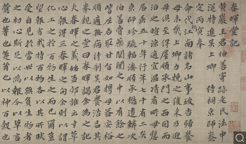 歐陽玄《春暉堂記》一文記王伯善孝敬母親,同時頌揚王母賢德。當時文人吳養浩取唐孟郊“誰言寸草心,報得三春暉”詩意,名其奉親之堂曰“春暉”,并請歐陽玄作此記。卷后題詩,均為詠頌王伯善奉孝母親之事。此卷書于“至元后己卯”(一三三九),歐陽玄時年五十七歲。其書學蘇軾,筆法渾厚穩健,剛勁流暢,筆畫精到,起承轉折分明,結體方扁,分間布白極其勻稱,是歐陽玄的代表作品,可謂書文并茂。