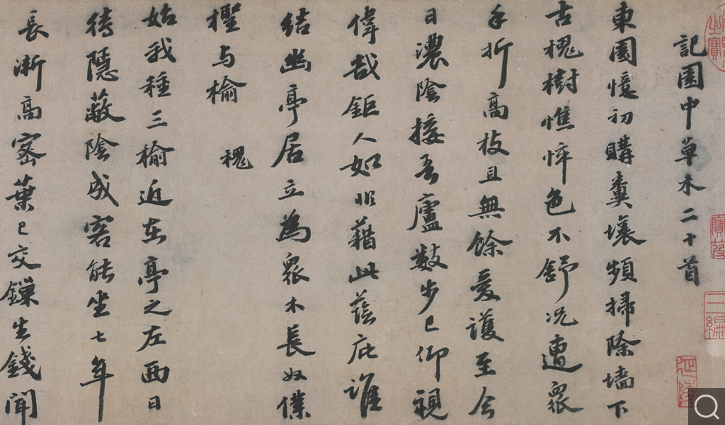 卷書《記園中草木二十首》,見于吳寬《家藏集》卷十九。詩后自題:“夏日在告,賦此以遣病懷。舜臣過訪園居,偶談及之,因請錄一過,亦多識草木之義也。”可知吳寬病中遣懷,吟詠庭園草木,并應(yīng)友人舜臣之請書成此卷。舜臣為盛虞,無錫人,著《端友齋錄》。吳寬此卷真、行、草三體相參相映,收放自如,筆畫穩(wěn)健,書風(fēng)質(zhì)樸,無意經(jīng)營,具有一種率意自然之美。