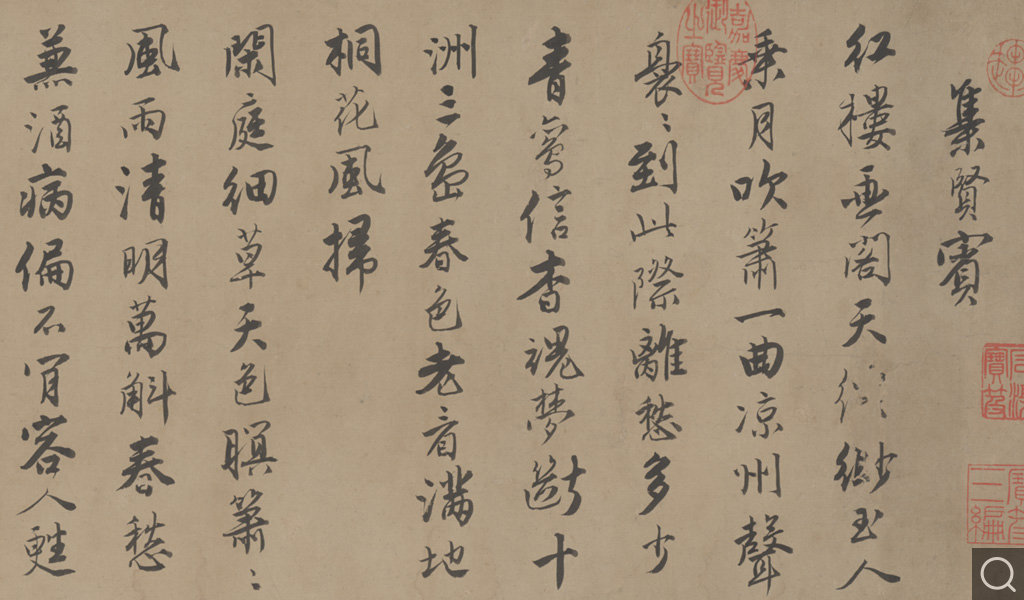 此卷書《集賢賓》《錦衣公子》《山坡羊》三組曲牌,《唐伯虎全集》卷四收入其中的絕大部分。唐寅書法風格取自趙孟頫,參以李北海筆意。明王世貞評唐寅書法:“伯虎書入吳興堂廡,差薄弱耳。”此卷書法舒展停云,結構嚴謹,筆畫婉轉流暢,風格俊秀瀟灑,達到了詞與書法的完美結合,可謂珠聯璧合,是其中年時期的代表作。