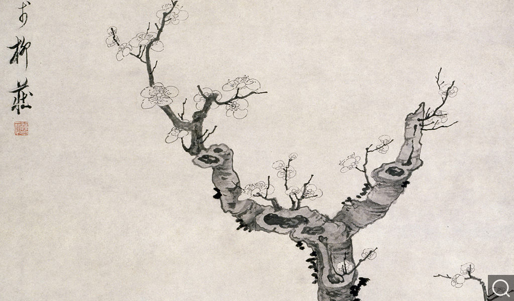 圖繪山石邊老梅吐出新枝,稀疏的梅花在新枝上綻放。圖中山石梅花造型富裝飾 趣味,線條沉著奇拙,略以淺絳暈染。