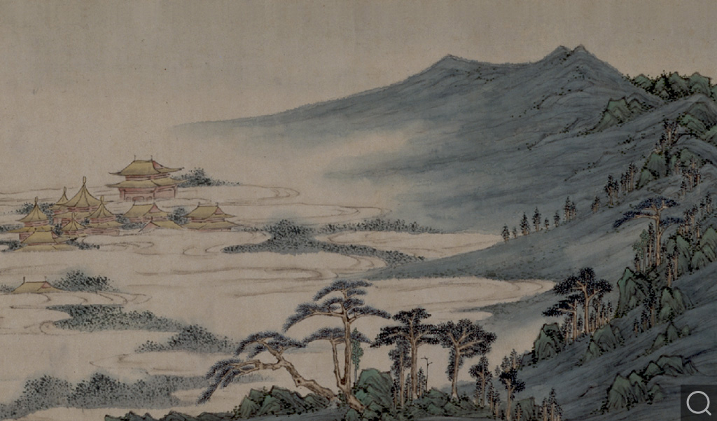 該圖表現的是秋天金陵一帶的山水景致,山石堅挺,林木蔥郁,其中有廟宇、古塔、宮殿、民居、舟船等,尤其接近卷尾的古城墻凸顯了金陵的地理特點。