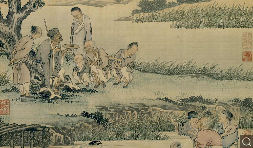 是圖描繪鄉間水畔,盲者作場,翁童、少年靜聽說唱,隔溪諸婦聞聲而來。在清代宮廷繪畫中,經常出現此類富有農村生活情趣的題材,或許是可以彰顯帝王居廟堂之高而心系百姓的緣故。畫法精工兼寫,人物面部勾勒填色,神態惟妙惟肖,衣紋流暢自然,頓挫有致,疏密相間,不乏清貴之氣。