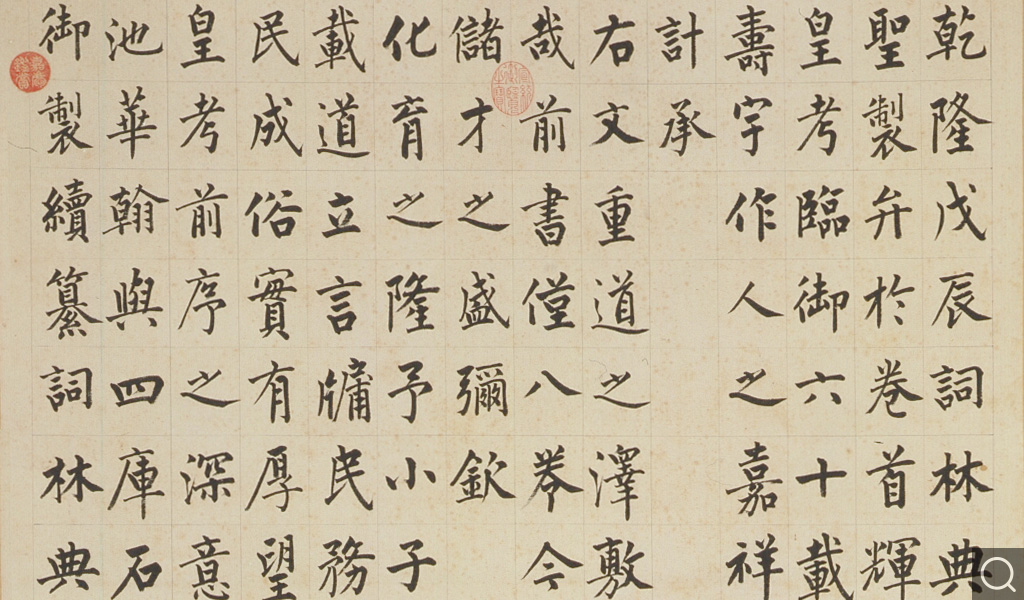 《詞林典故》一書于乾隆十三年戊辰(一七四八)編纂,八卷,乾隆皇帝曾為此書作序。嘉慶九年甲子(一八〇四)此書續增至六十四卷,嘉慶皇帝亦為此書作序。序文作于成書后的乙丑年(一八〇五),永瑆此幅作品便是恭錄嘉慶皇帝的《御制續纂詞林典故序》。雖未署年款,但時年至少已五十四歲。據記載永瑆五十歲后開始學歐陽詢,時正值喜學歐書之際,其功力深厚,法度嚴謹,既得歐陽詢的勁健爽利,又不失趙孟頫的清麗秀逸,兼顧歐、趙二家楷書的特點,并表現出自家的風范。