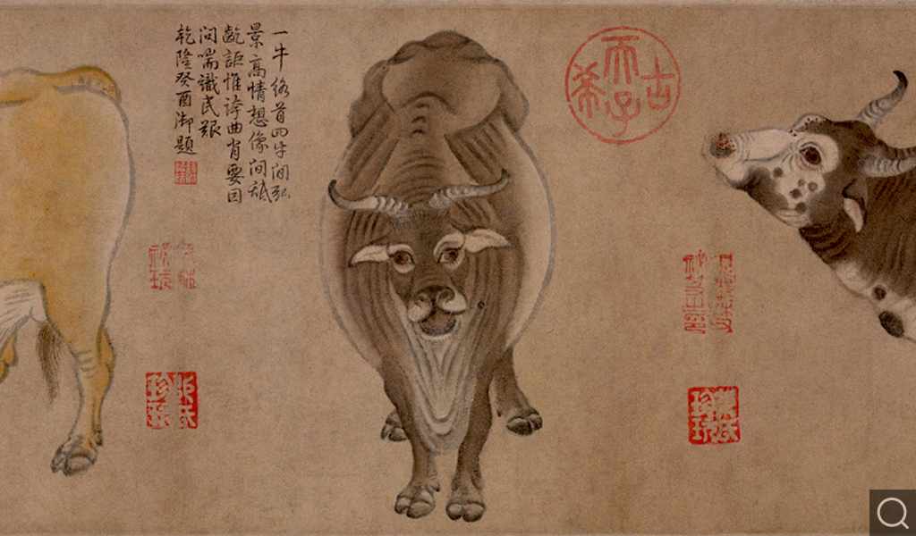《五牛圖》在宋代曾是南宋皇室的收藏。此后,經(jīng)過了趙孟頫、太子書房等收藏,明代后期為項(xiàng)元汴所有。清初為宋犖收藏,乾隆初年藏于汪學(xué)山“求是齋“,后進(jìn)入乾隆的宮廷收藏之中,八國聯(lián)軍侵華時(shí)流出清宮。上個世紀(jì)五十年代,經(jīng)周恩來總理特批,從香港回購,重歸故宮。收回時(shí),傷痕累累,一九七七年,經(jīng)故宮專家重新揭裱、補(bǔ)筆、全色,重新煥發(fā)生機(jī),成為文物修復(fù)中的一個典范案例。