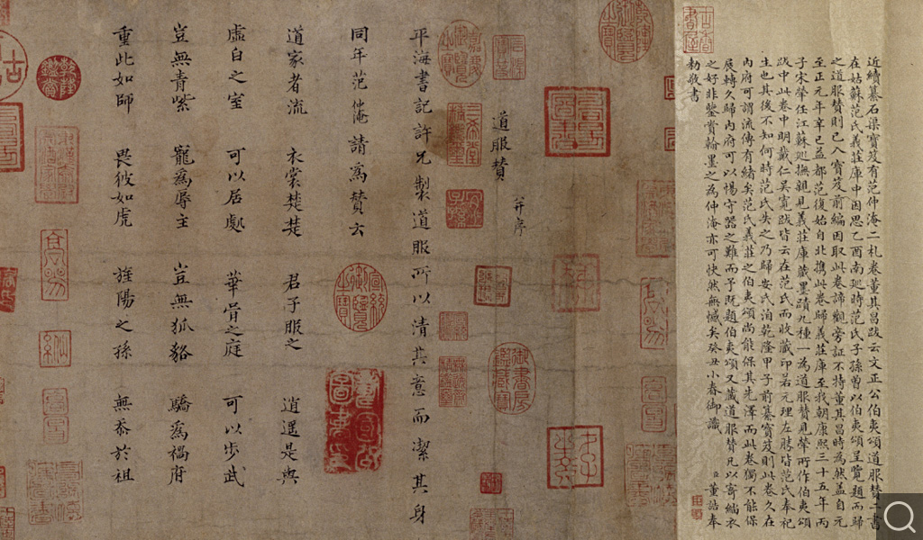 曾經宋范氏義莊、清安岐、清內府收藏。民國時,流散出宮,張伯駒從北京琉璃廠古玩商蘄伯生手中購得。一九五六年,張伯駒將自己珍藏了幾十年的八件書畫,無償捐給了文化部。最后全部歸于故宮收藏,其中就包括這件《道服贊》。