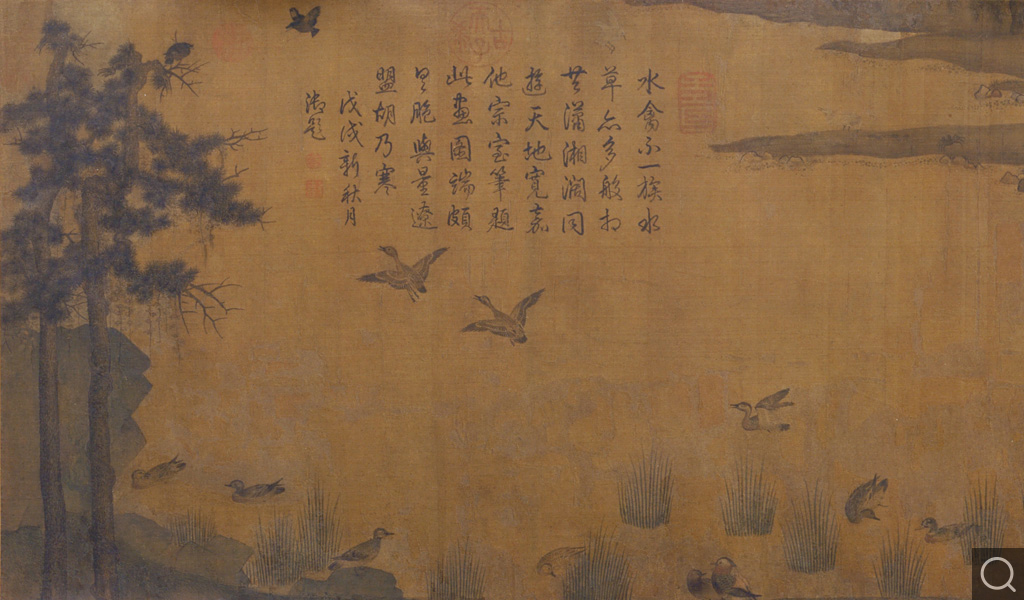此卷為開闊的平遠式構圖,遠景汀渚曲折,垂柳弄陰,一派仲夏景象;中景為遼闊的水面,其上有白鷺、野鳧、鴛鴦等水禽嬉戲弄波,富有情趣;近景繪高大的蒼松,枝繁葉茂,一派生機。圖中樹木用宋人普遍運用的夾葉法表現,茂密的樹葉為筆法工整的雙鉤填色,枝葉相互疊加,既有層次又不失之于瑣碎。圖中水禽的畫法深受崔白筆墨的影響,不刻意求工求細,而是通過靈動的筆法描繪出禽鳥悠然自得的神態。宋代山水畫多以李唐、范寬高遠式構圖取景,展現山水的壯美。描繪一湖兩岸小景致的作品,在北宋僅有梁師閔、趙令穰和趙士雷數人而已。他們的這種畫風,為當時畫壇增添了田園詩的意境,對元以后山水畫簡淡抒情的審美取向有一定的影響。