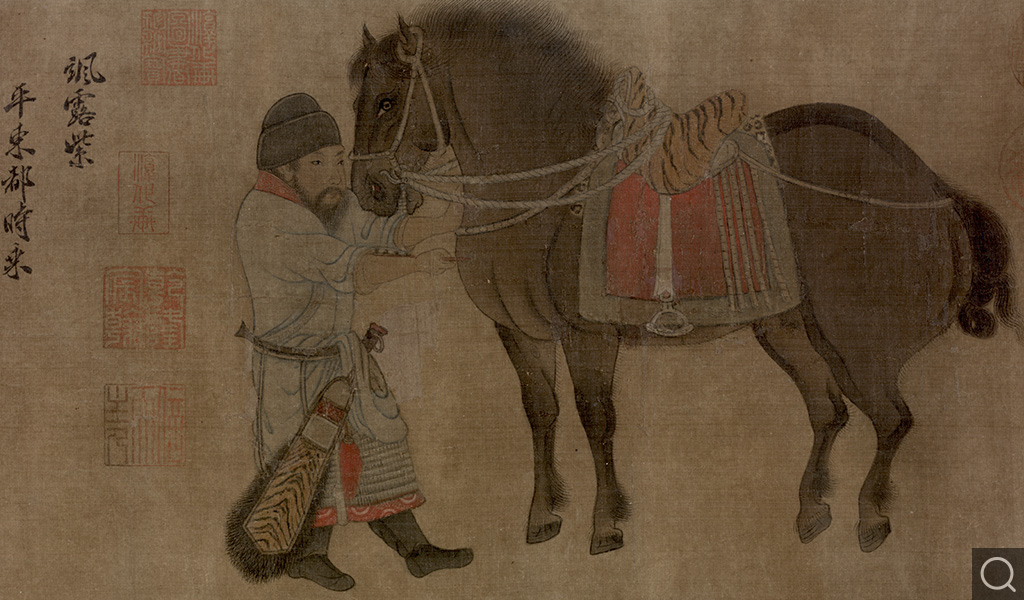 趙霖(生平不詳),雒陽(今河南洛陽)人,以專擅人馬畫供職于金世宗朝(一一六二 — 一一八九),畫風(fēng)樸拙渾厚,筆法蒼健有力。《昭陵六駿圖》(《石渠寶笈續(xù)編》著錄名“畫唐太宗六馬圖卷“)是其唯一的傳世作品。