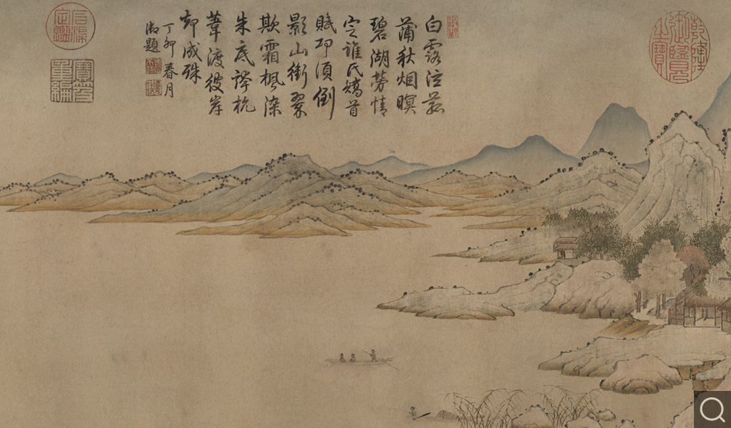 卷后自題七言絕句:“山色空濛翠欲流,長江浸徹一天秋。茅茨落日寒煙外,久立行人待渡舟。“款署“吳興錢選舜舉畫并題“。鈐印“舜舉印章“白文方印、“舜舉“朱文方印、“錢選之印“白文方印。手卷引首乾隆皇帝御題“秋江待渡“四大字,鈐“御書“朱文方印,本幅有乾隆行書自題五言律詩一首,后紙有陳恭、胡惟仁、朱庸、胡敦等十七家題記或題詩。引首、畫心、前后隔水、尾紙有高士奇、安岐、清內(nèi)府等鑒藏印近八十方。