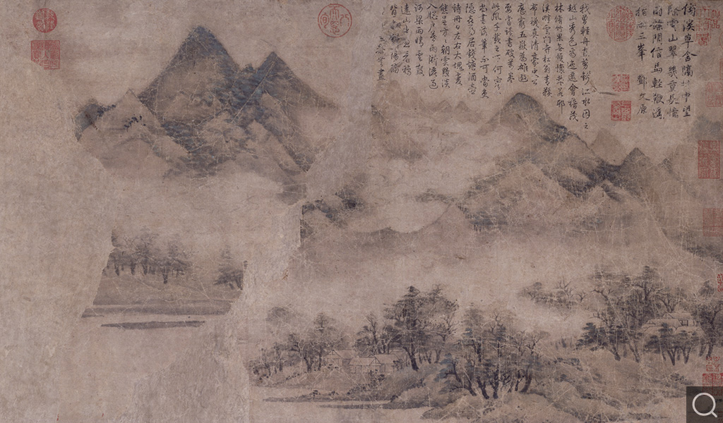 曾經明華夏、項元汴、王日宣及清乾隆、嘉慶內府收藏。民國時,溥儀攜出故宮。一九四四年八月,此圖在長春偽滿皇宮中被人撕毀,現僅存三分之二。原幅作者自題和趙孟頫題記已殘缺,八璽中“宜子孫““三希堂精鑒璽“已不存。本幅殘卷,經東北博物館(今遼寧省博物館)收入,后調撥回故宮博物院。后跋原有柯九思、倪瓚等題跋十余段,現僅存李國蕃、文志仁二家題記。尾紙題跋殘段,一九六五年收購重回故宮。