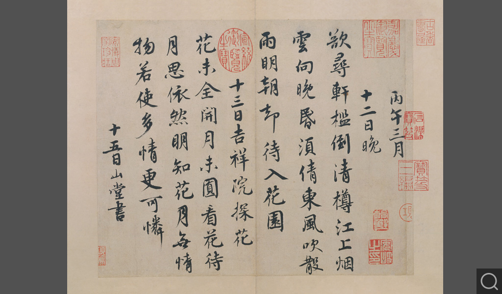 (一)山堂帖。行楷書十行,錄自作七言絕句二首:《丙午三月十二日晚》和《十三日吉祥院探花》,后題“十五日山堂書”。按丙午為治平三年(一〇六六),作者五十五歲,正在知杭州任上。書風已入晚年:筆畫圓勁老辣,無意于佳,而姿媚之態自然流露。“吉祥院”與“山堂”(即有美堂)皆杭州名勝。