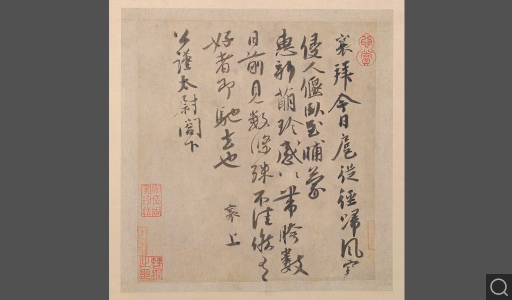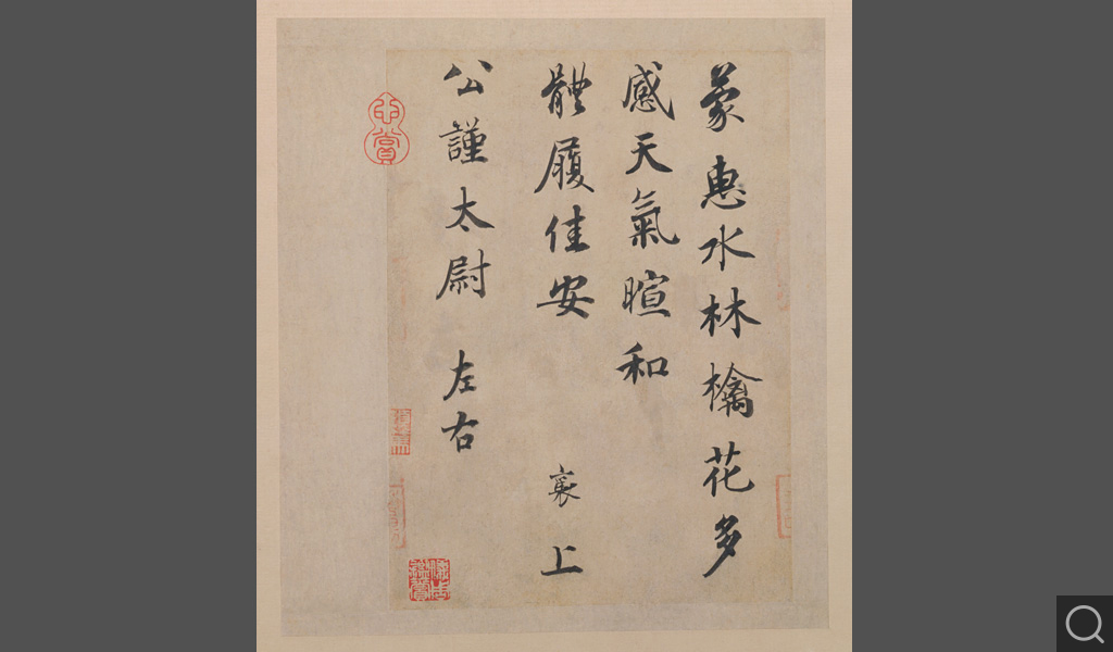 (三)蒙惠帖。行楷書四行,書札。內容為鳴謝贈花。上款“公謹太尉”,據考為作者友人李端愿。治平初年,他除醴泉觀察使“奉祠”閑居在汴京,蔡襄則任職翰林院,二人來往很勤。此札字體圓潤端謹,使轉精彩絕倫,雖僅二十四字,卻為作者晚期酬答知己的精心力作。