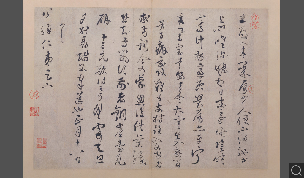 (七)入春帖。草書十一行,書札。內容主要是告知對方自己“今又蒙恩,復供舊職”,并希望以端硯頂出前贈對方的銅雀臺瓦硯,另贈“十三兄”。上款“公綽仁弟”,據考應當姓葛,是蔡襄妻族中的近親。慶歷三年,蔡襄“以秘書丞集賢校理知諫院兼修起居注”;皇祐三年,他罷福建路轉運使任,赴京再官“修起居注”,即所謂“復供舊職”。這封書寫于正月十八日,正在北上赴京途中。作者時年四十歲,用筆輕靈優雅,更是冊中唯一的草書書札。