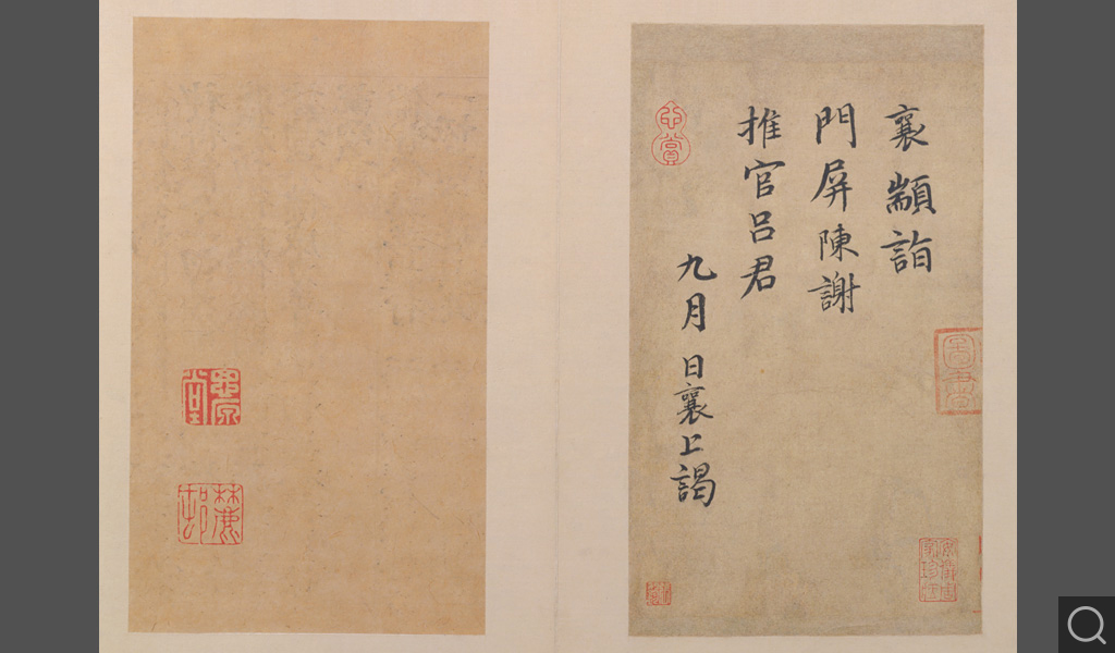 (八)門屏帖。楷書四行,是一張手書的“名刺”,或曰“門狀”,當時官員、士大夫訪人時“報門”之用。上款“推官呂君”,已不可考。以書風論,與蔡襄皇祐四年(一〇五二)左右所書的《謝賜御書詩》頗為近似,應為其四十歲后典型的正楷書作。