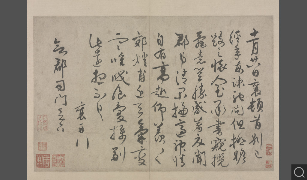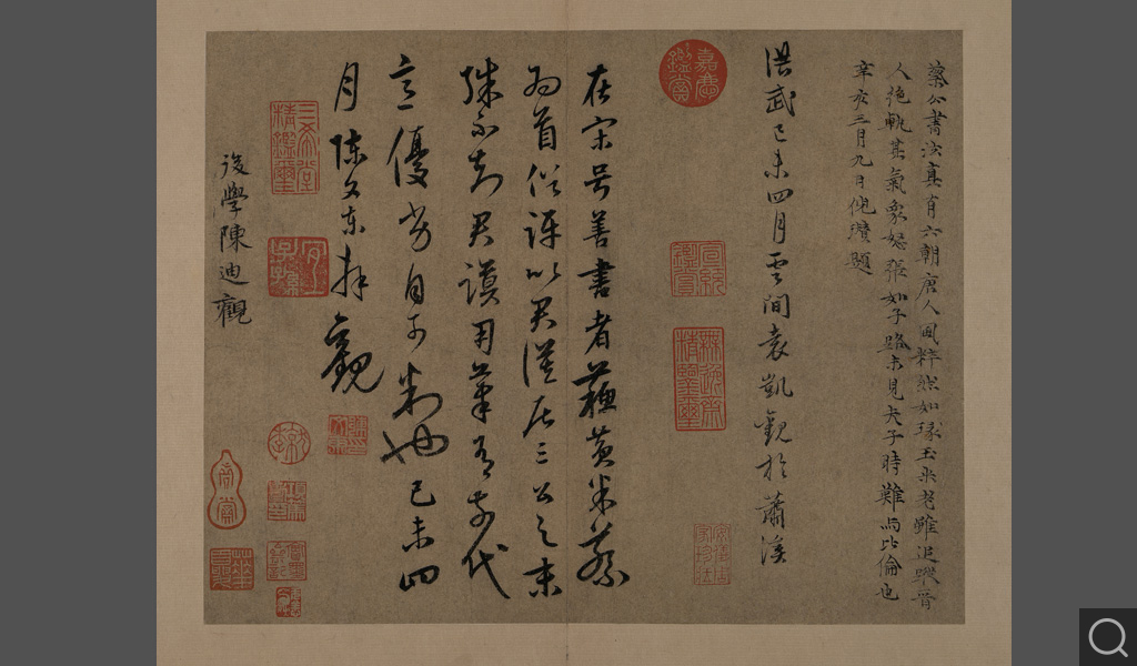 此冊第九開為題跋。內含倪瓚辛亥(一三七一)三月九日題、袁凱洪武己未(一三七九)四月題、陳文東己未(一三七九)四月題,及明初陳迪觀款。