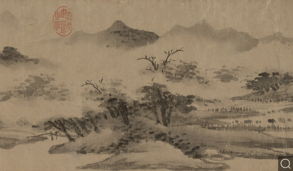 沈周六十二歲時喪妻,此為葬妻前臨仿米友仁云山圖筆意而作。圖寫云中西山之景,因有喪妻之痛,加之前日大雨,心情極為沉郁,第二日雨止,心情略微豁朗,故有此作。近景處有陂陀林木,湖泊環繞,中景岸渚上有房屋數間,遠山在云霧中時隱時現。該圖以粗筆寫意,筆力迅疾縱逸,墨色濃淡相間,胸中沉郁的情感溢于筆端。