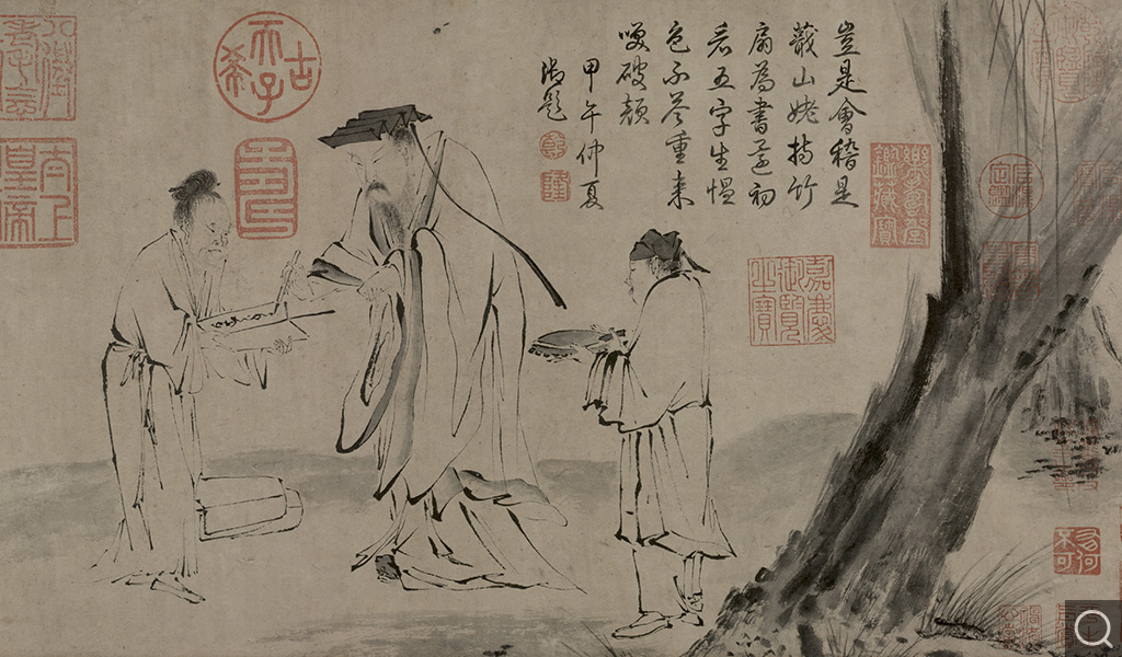 此卷圖繪東晉大書法家王羲之為老媼書扇的故事。右署款“梁楷“,本幅有弘歷題詩,后有元、明諸家題跋,且有“桂坡安國賞鑒“,項元汴諸印,清代乾隆、嘉慶、宣統內府諸印。徐邦達先生指出:“此圖柳樹用簡筆直皴,每筆多斧鑿痕,而筆與筆之間又大都很不貫氣;樹下長草亦雜亂無章,人物衣紋用蘆葉描法,稍好,然亦輕飄不夠沉著;款字尤生硬而較嫩弱,很明顯題跋也出于臨摹,并且好像是一手寫的;吳寬、項元汴跋亦偽,但寫得比較像。項氏諸藏印顯是個臨摹本,元人印亦偽。此本大約出于清初人復制。“在此基礎上,肖燕翼先生注意到明清人著錄中多有梁楷《右軍書扇圖》的記載,故宮藏本中元張淵的題跋與明李日華看到的相似,當是在后者基礎上加以改動、刪減而成。