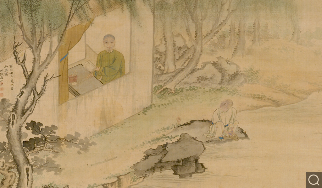 在畫法上,用筆精微,人物五官刻畫生動,神態傳神。背景樹石、茅舍、溪流,荒寒而僻靜,描繪真切自然,表現出了董邦達在清貧中發奮讀書之情操。該圖作于雍正十年(一七三二),董邦達時年三十四歲,尚未考中進士。