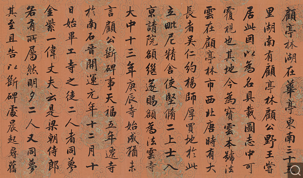 此卷節臨趙孟頫《寶云寺記》。寶云寺建成于唐大中十三年(八五九),位于今上海市金山區亭林鎮(原屬松江縣)。相傳寶云寺曾有房一千零四十八間,梵宇軒昂,號稱“江南名剎之五,華亭之最”,后屢修屢毀。元代重修時立碑,碑文《松江寶云寺記》由趙孟頫書丹。全卷結字勻整平和,筆致瀟灑俊朗,既有唐人楷法嚴整以及顏字端莊凝重的特征,又具趙孟頫書法遒美暢達之意,是清代中晚期館閣體書法代表作之一。是卷鈐有“嘉慶御覽之寶”“宣統御覽之寶”。