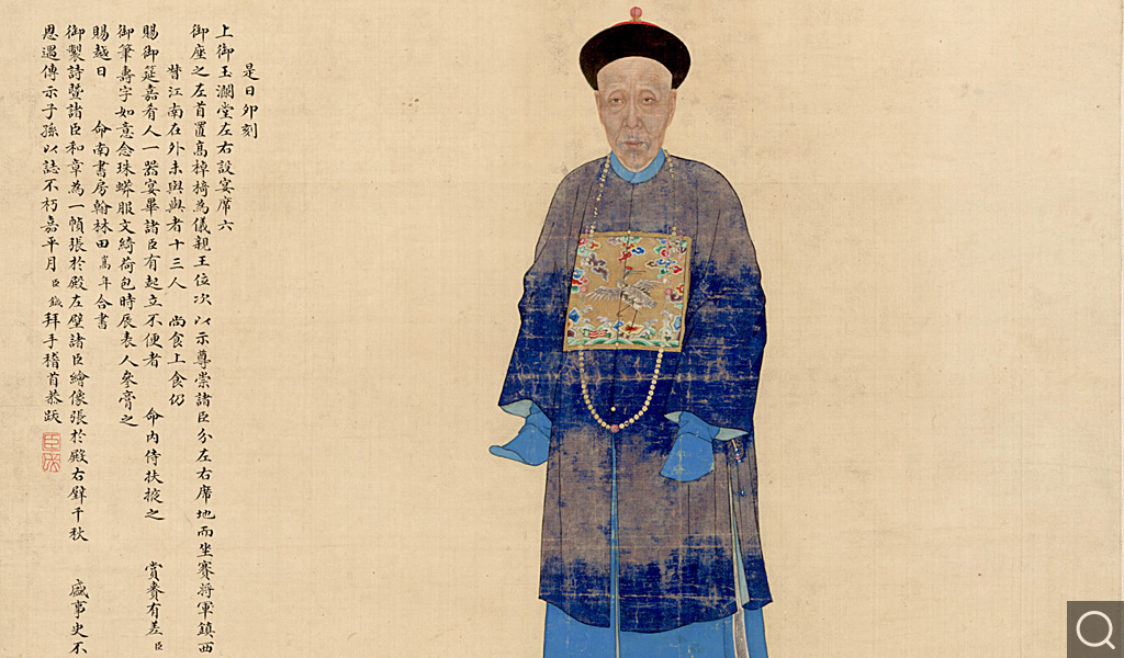 根據幅上畫家之恭題,可知道光三年(一八二三)在萬壽山玉瀾堂賜宴,并命內廷畫家分別為黃鉞等十五位出席宴會的老臣繪制了畫像。黃鉞(一七五〇 — 一八四一),字左田,號左君,安徽當涂人。乾隆五十五年(一七九〇)進士,授戶部主事。因對權臣和珅(時主管戶部)不滿,借故請假回籍,“掌教皖南北書院十載”。