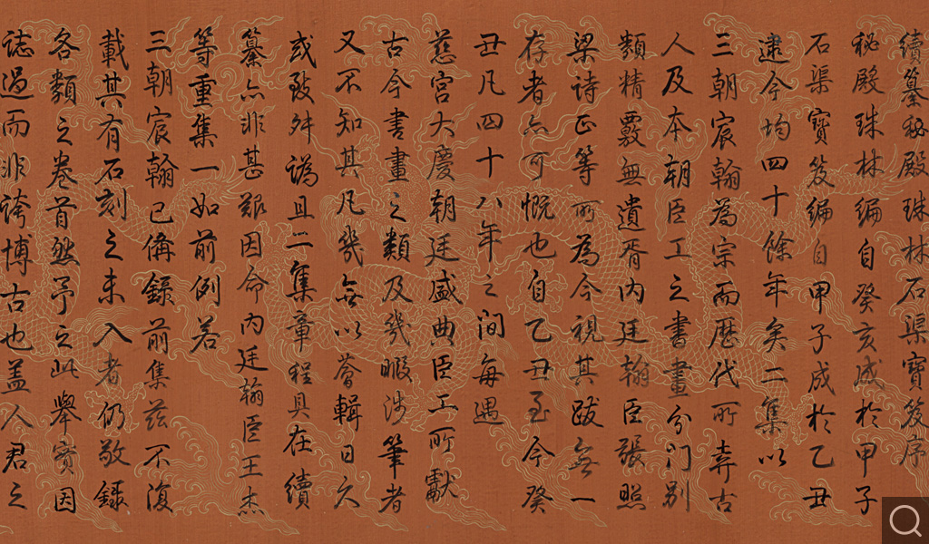 此卷緙絲包首,外簽緙以“御筆續纂秘殿珠林石渠寶笈序”十三字,配以清宮原裝錦袱雕匣,匣表面嵌螺鈿刻“御筆續纂秘殿珠林石渠寶笈序”。本幅書《續纂秘殿珠林石渠寶笈序》,詳述續纂之緣由、內府藏品條件、人員、體例等。