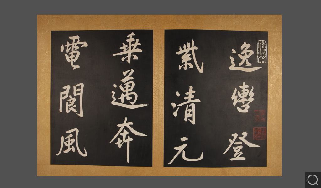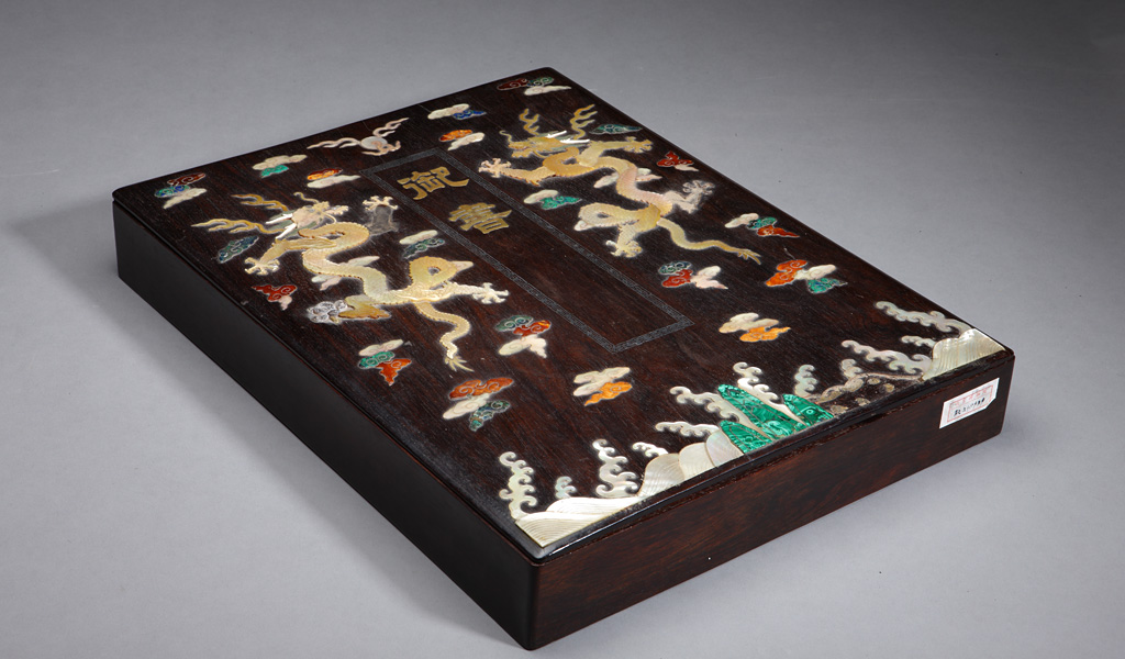 本件織錦帖面,正面金線織造雙龍,下為福山壽海。封底織立龍及銀錠、如意紋飾,龍身鱗片生動,虎掌、鷹爪,用火焰、珠光襯托出威嚴。寓意江山永固,財富、長壽之意,做工精湛,造型靈動,精美絕倫。并附有一“百寶嵌”木盒。木盒用精心選料的紫檀做成,其上嵌螺鈿、青金石、孔雀石等構成二龍戲珠捧“御書”二字及海水江崖、如意云紋圖案。“御書”字用銅鍍金,周圍鑲銀絲回紋。