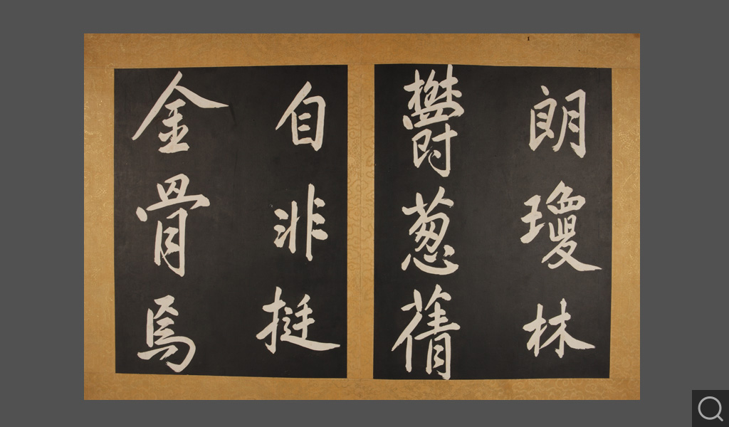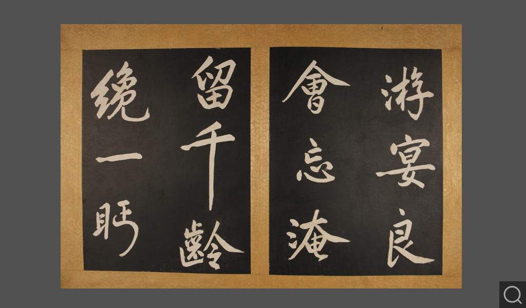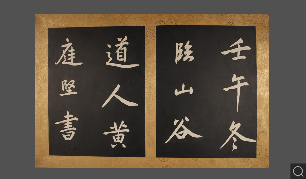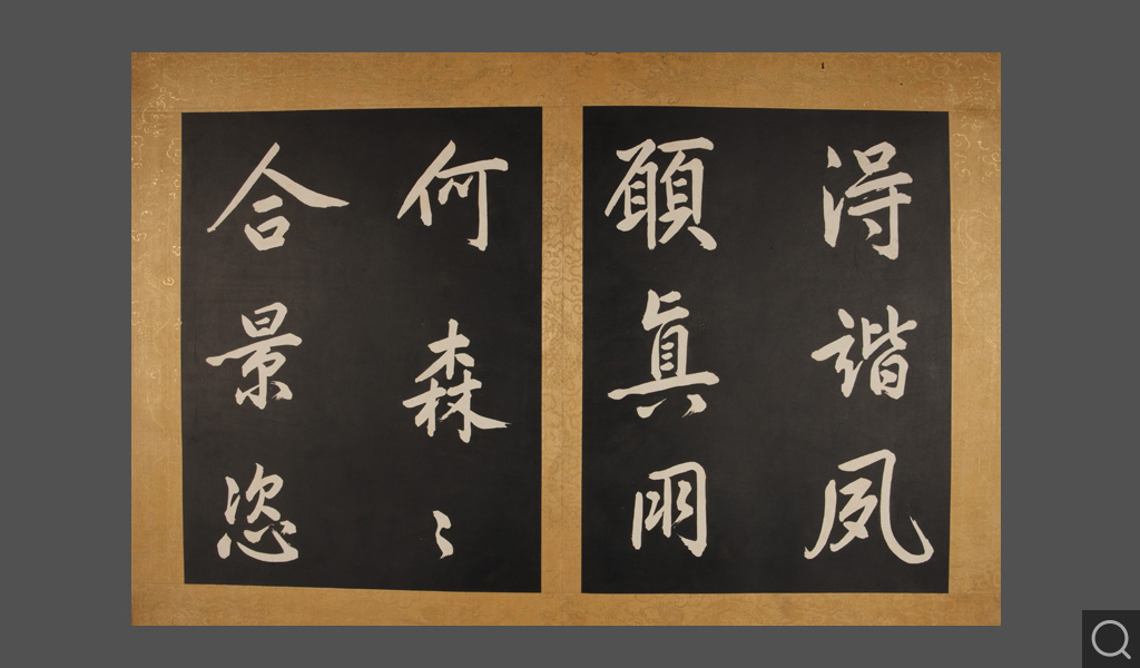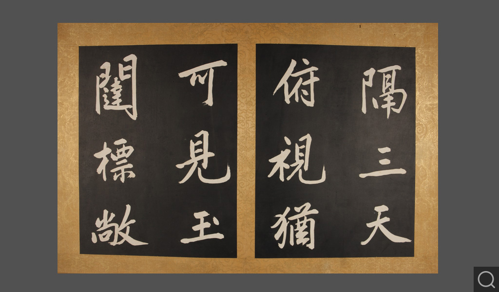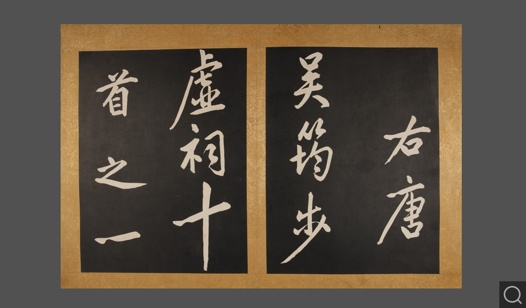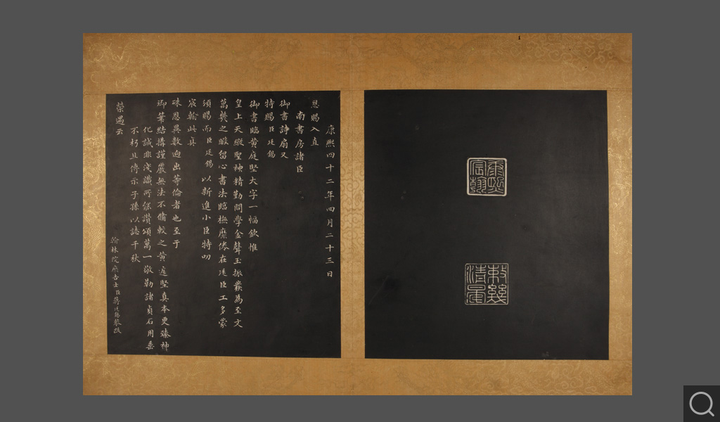 乾清宮貯藏 鑒藏寶璽:石渠寶笈所藏 寶笈三編清康熙四十二年(一七〇三),康熙帝玄燁將自己所臨一幅《黃庭堅行書步虛詞》賜給當時正入值南書房的大臣蔣廷錫。蔣廷錫將這幅大字摹刻傳拓,以“用垂不朽”、“且傳示子孫,以志千秋”。《石渠寶笈三編》著錄為“圣祖仁皇帝御臨黃庭堅書唐吳筠步虛詞墨刻”,貯藏于乾清宮。《石渠寶笈三編》,繼承了《石渠寶笈續編》的體例,將碑帖列為“摹刻法帖”,收入歷代刻帖,如《宋拓懷素書藏真、律公帖》《絳帖》《星鳳樓帖》等;以及清代宮廷和大臣的一些刻帖,如清成親王永瑆書《詒晉齋石刻》、勵宗萬等書《高宗純皇帝御制盛京賦四體墨刻》、劉墉書《清愛堂石刻》等。