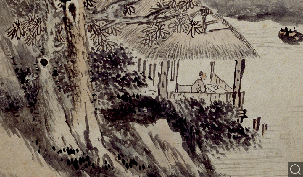 陳書的山水畫不僅有學習繪畫傳統的摹古之作,還有大量的寫生圖。她善于觀察自身的生活環境,熱衷于表現自然。此圖軸便是陳書根據室外一株有三百年樹齡的古松,創作的寫生山水畫。全圖用墨不多,獨以石青加淡墨為之,松翠色如玉,清涼可人。在表現手法上近景畫得較實,追求具象的描繪,甚至水榭茅草頂的邊緣,也以有條不紊的線條一根根繪出。亭榭中的人物雖小如豆許,但他觀書的動態,及面前的書都畫得具體而微。遠景表現得虛、抽象,竹叢以墨點橫排排出,遠山以淡墨皴染,山脈的肌理、質感、凹凸變化交代得不很明確,作者借以其虛更襯托出近景的實,展示出的境界既帶有一種脫去塵俗的寧靜超撥,悠閑自在,同時又帶有與觀者近距離的親近感,此屋此山可居可游。景觀與意境的豐富和深幽,令人神往。形式與內容的完美結合,令人贊嘆。乾隆帝分別在甲申(一七六四)、甲辰(一七八四)、庚戌(一七九〇)、癸丑(一七九三)御題詩四首。