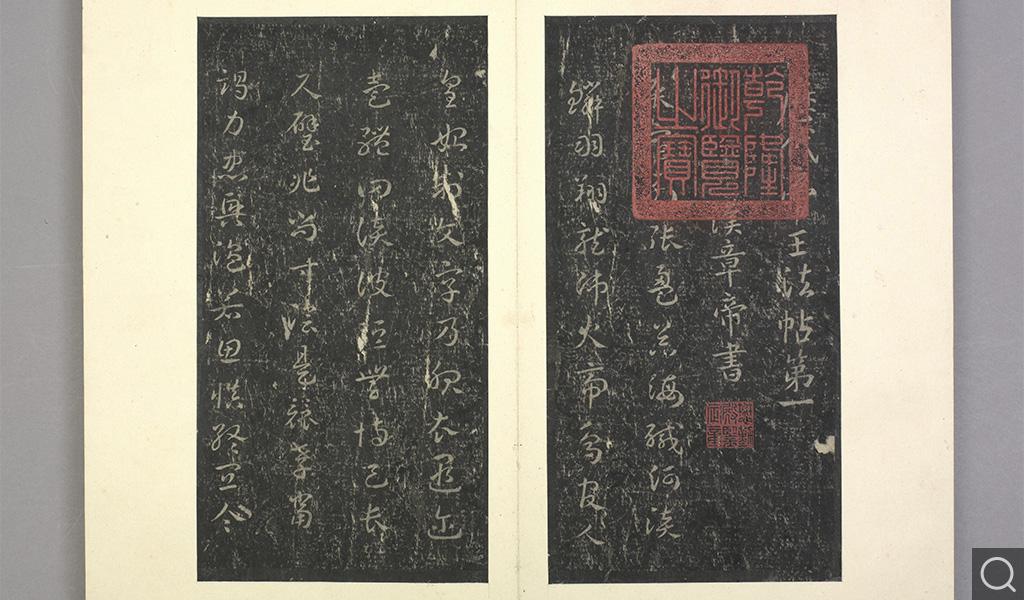 是帖以提梁木匣盛之,匣面刻填藍(lán)色楷書“淳化閣帖,乾隆戊午鑒定宋拓”,填朱“石渠寶笈”“寶笈重編”二印。按照木匣上刻字,乾隆戊午年為乾隆三年(一七三八),說明至少乾隆三年時(shí)這部帖已在宮中。《石渠寶笈續(xù)編》著錄“鑒藏寶璽七璽”全,但帖中未見“七璽”。