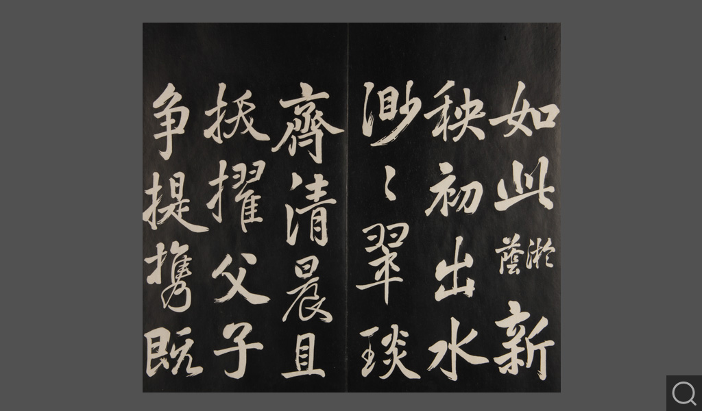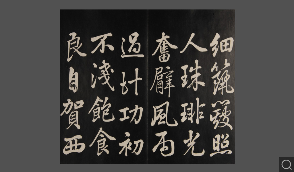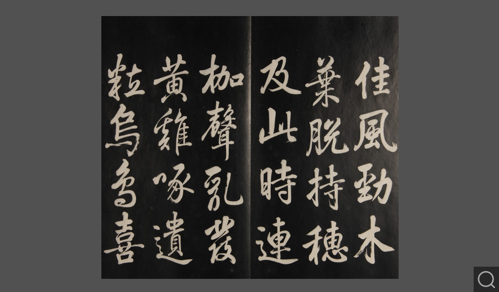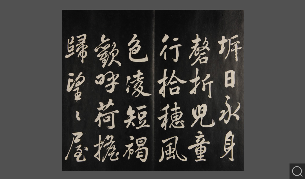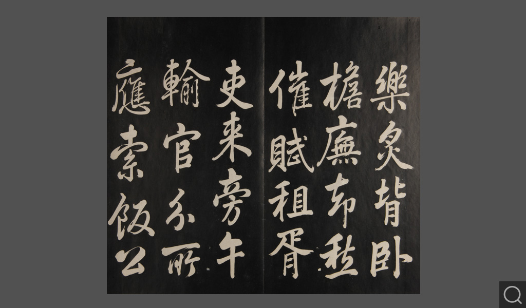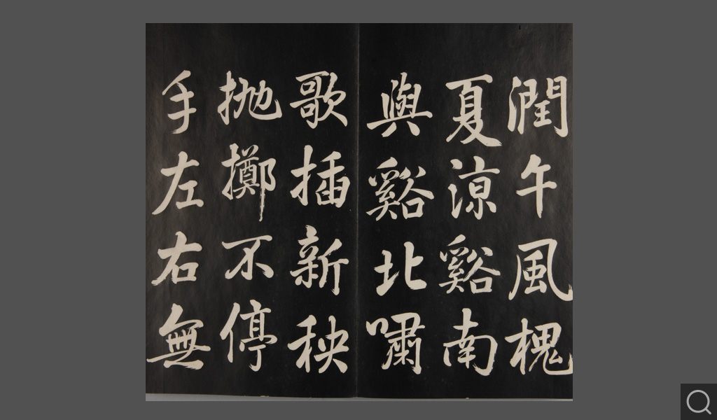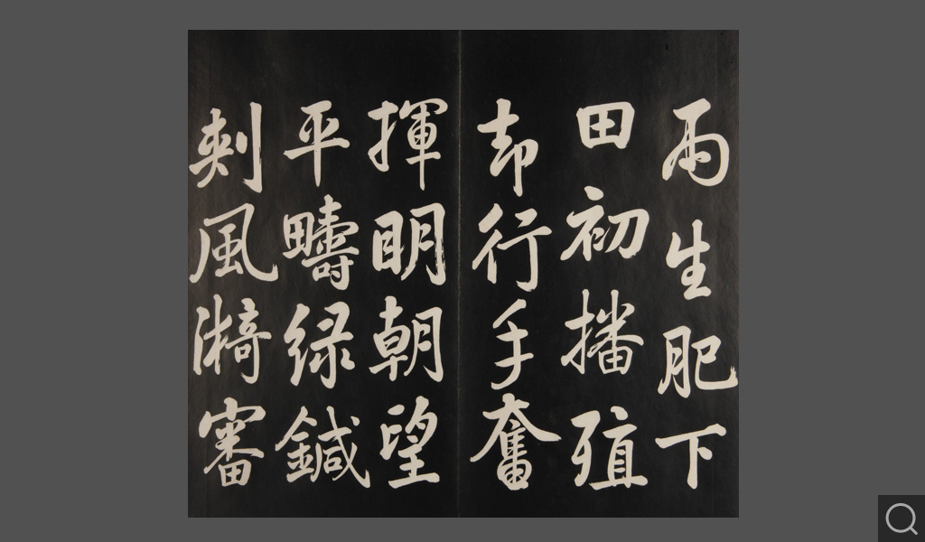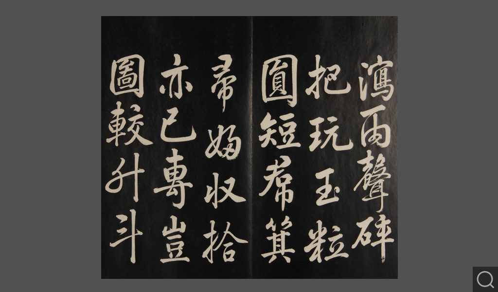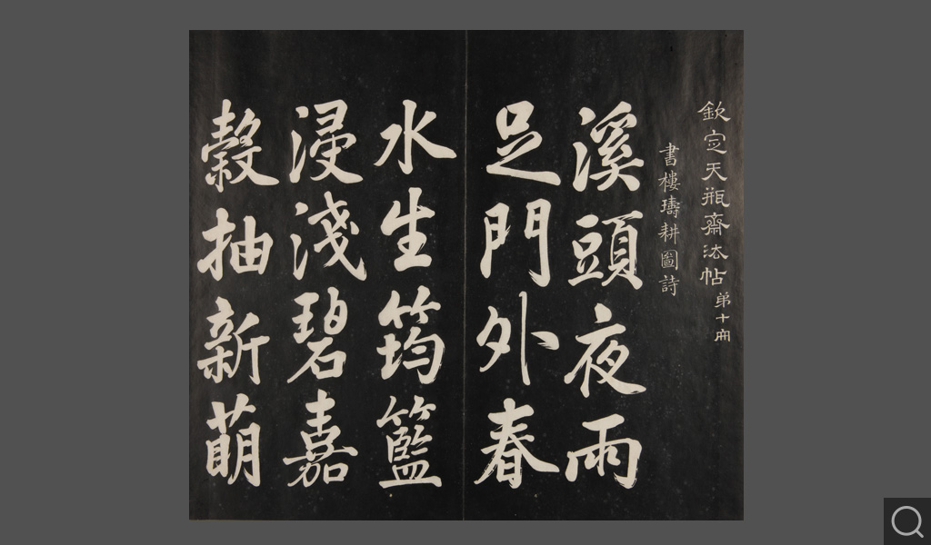 是件為清乾隆二十二年(一七五七)摹刻,帖收大臣張照書。該帖第一、二、三冊收張照恭書御制詩文,第四、五、六、七、八冊收張照臨晉、唐、宋、元、明歷代名家書,第九、十冊收張照自書詩文。