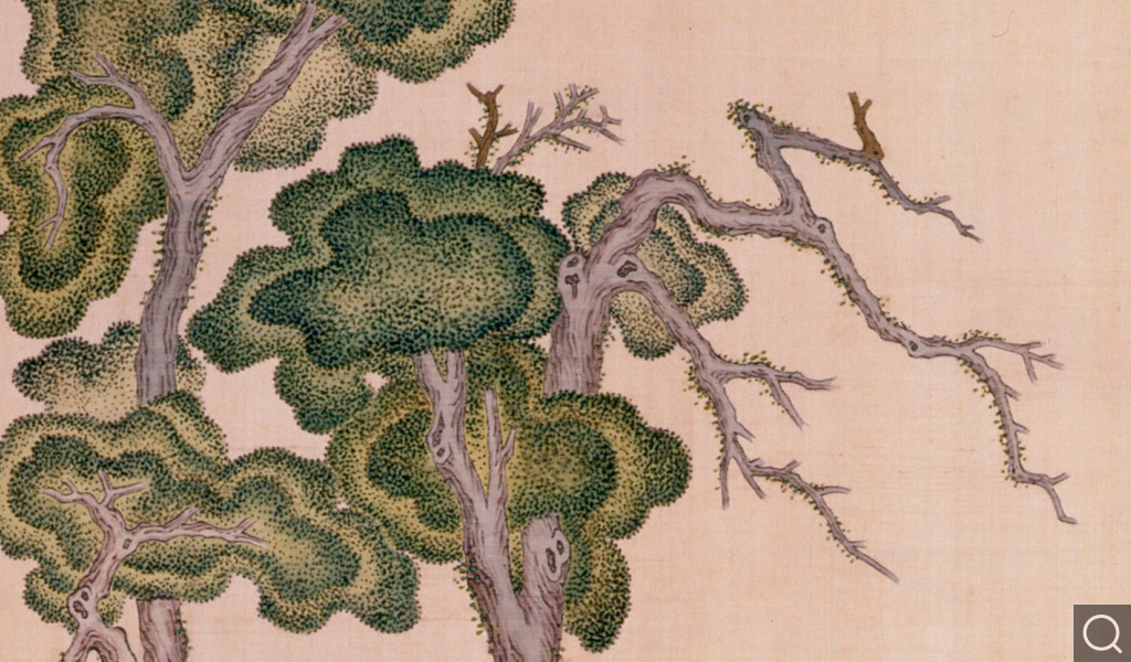 本色地上緙織岱廟漢柏一棵,古柏挺立。此圖是乾隆皇帝南巡經(jīng)過此地,再次看到此樹時,由感而發(fā)所作的漢柏圖,并將此經(jīng)歷織畫于上,末尾還緙 “乾”“隆”印。此作品也是緙與畫相結(jié)合,緙織漢柏形狀,其上用色彩渲染,顏色不多,卻將樹的蔥郁以點染描繪出來。