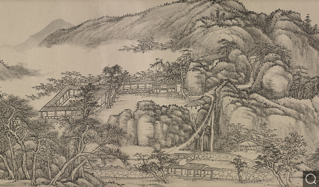 張宗蒼(一六八六 — 一七五六),字默存,江蘇吳縣人。學畫于“婁東派”黃鼎,初官河工主簿,乾隆十六年南巡獻冊,受特知召入。乾隆十八年“著加恩賞給戶部額外主事”。以老乞歸。《清史稿》稱:“宗蒼山水,氣體深厚,多以皴擦取韻,一洗畫院甜熟之習,被恩遇特厚,所畫著錄石渠者百十有六,多荷御題。”乾隆帝稱贊其畫有士氣,故宮博物院藏張宗蒼《畫弘歷撫琴》軸,乾隆裝扮為文人在深山中撫彈古琴。乾隆曾十三次在張宗蒼《畫山水》軸上御題。在其卒后十三年題:“山房宛在宗蒼畫,筆韻峰姿氣韻投。”卒后三十余年后題:“又對宗蒼畫,相看意與遲。”可見乾隆喜愛之情,由此不難理解干筆渴皴的筆法為乾隆內府山水畫的主流風格。