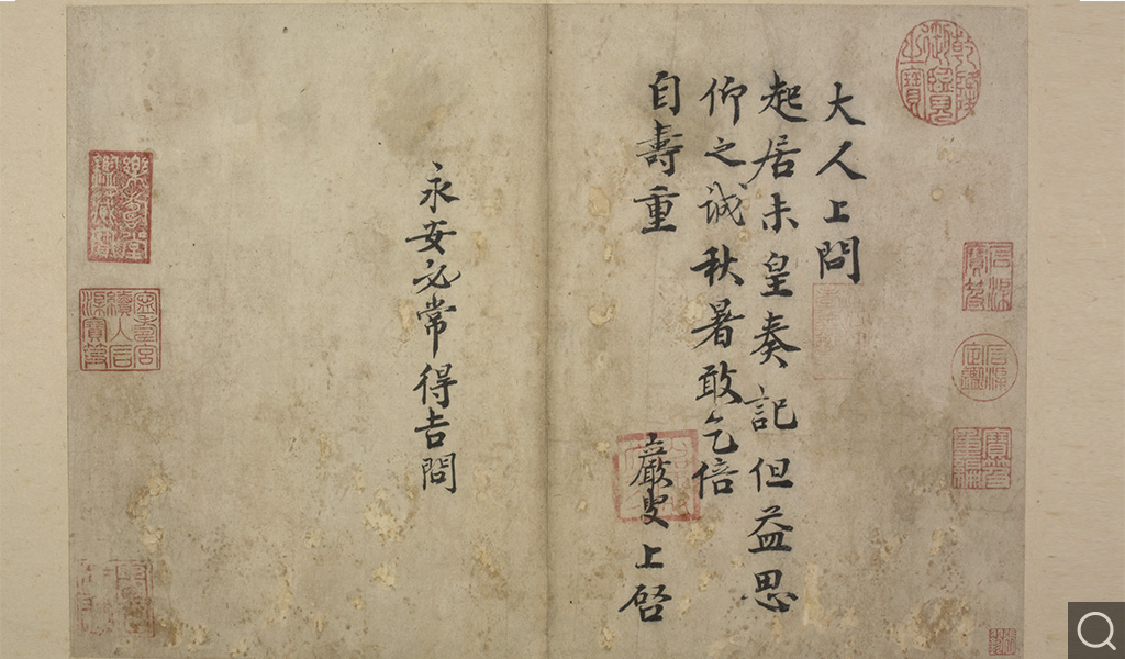 本幅款署“巖叟上啟”,鈐“巖叟”。此帖間架穩重,運筆遒勁渾厚,乾隆時曾將其刻入“三希堂法帖”。本開鈐“乾隆御覽之寶”“石渠寶笈”“石渠定鑒”“寶笈重編”“寧壽宮續入石渠寶笈” ,其余三方鈐于最后一幅。