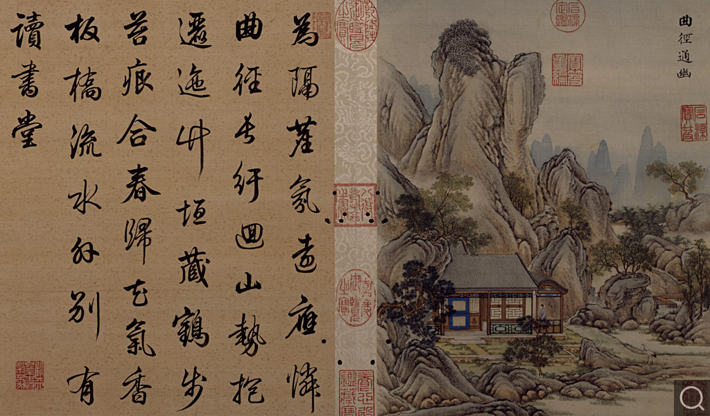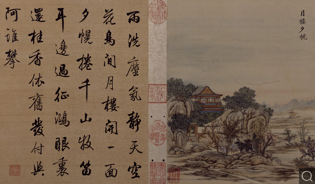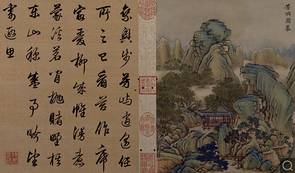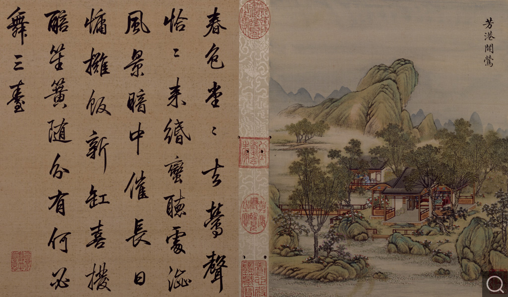本冊十五對幅,設色畫《御制小園閑詠》十五首詩意,并各標名,款署“唐岱恭畫”。鈐“唐”白文正方印、“岱”朱文正方印。