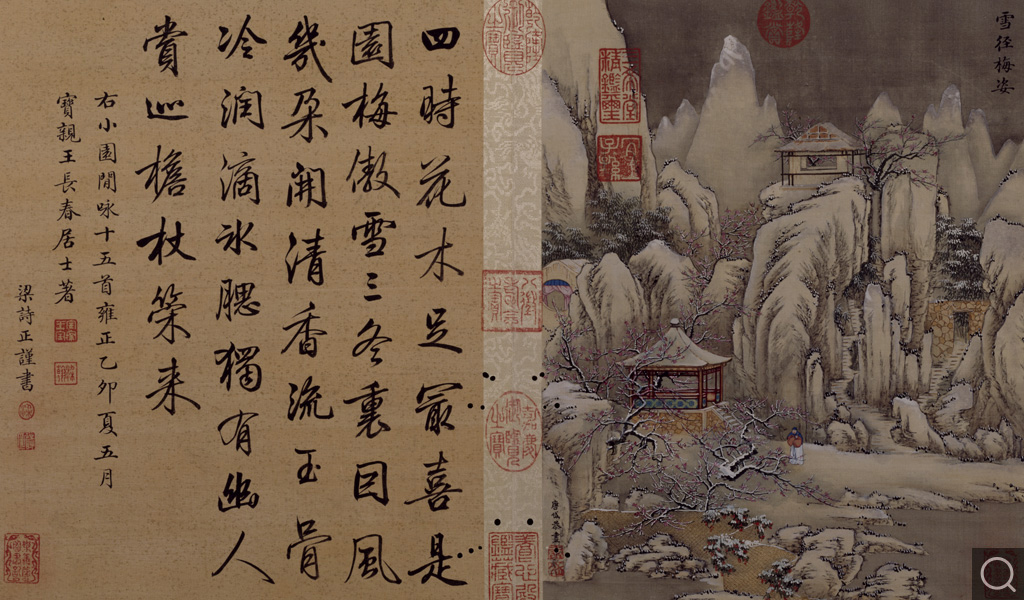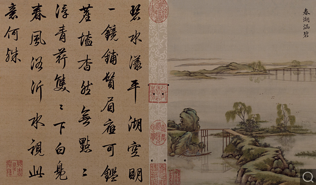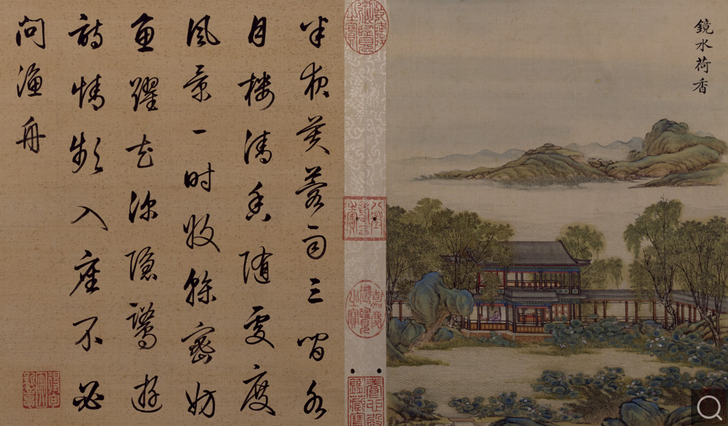 對幅御制詩十五首,末幅題:“右《小園閑詠》十五首,雍正乙卯夏五月,寶親王長春居士著”。鈐“寶親王寶”“染翰”。款署“梁詩正謹書”。鈐“梁”朱文橢圓印、“詩正”白文正方印。每幅分鈐“觀天地生物氣象”“攜筆流云藻”“微言晰纖毫”“廓然大公”“有吾與點也之意”“耽書是宿緣”“會心不遠”“讀書晰理”“得句因新意”“物來順應”“居敬存誠”。
