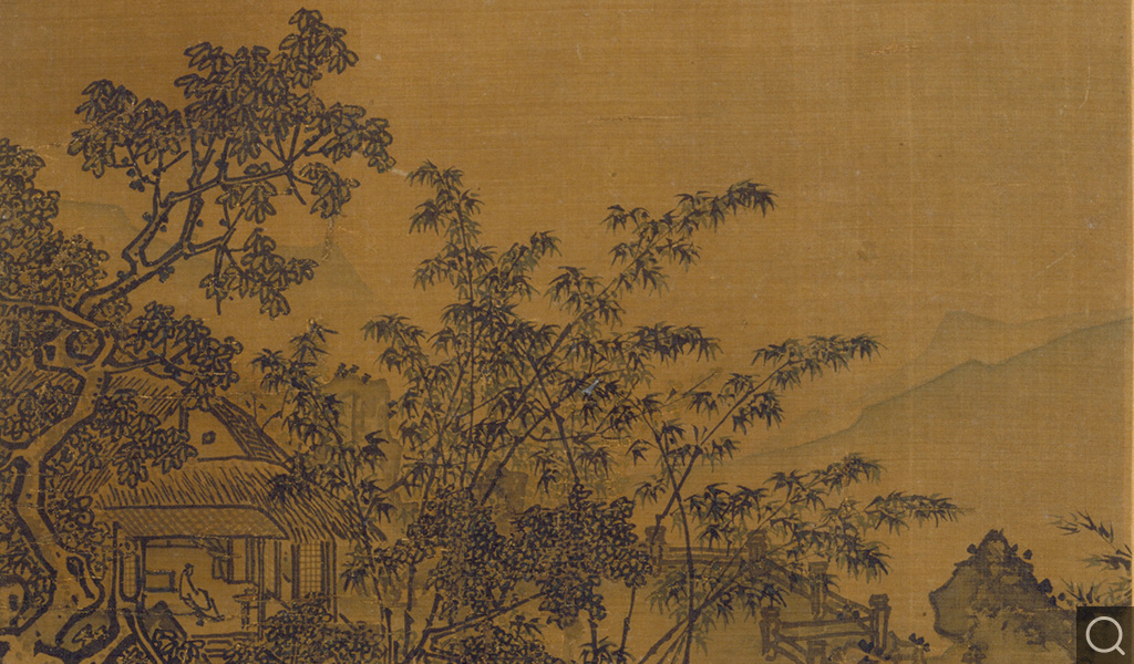 是幅為《宋元寶繪》冊第五開。此開著錄為:“淺設色畫山水,無款印。”簽題“宋夏圭”。左為圓幅。行書題:“記得當年故國游,風生天際碧云秋。巖扉暖護青蘿幕,澗水涼分白苧裘。竹化白龍蒼霧濕,池藏金鯉錦萍收。不知近日吟壇友,清興還如社里不。”款署“越東桂宜”。鈐“聽雨軒”朱文正方印。