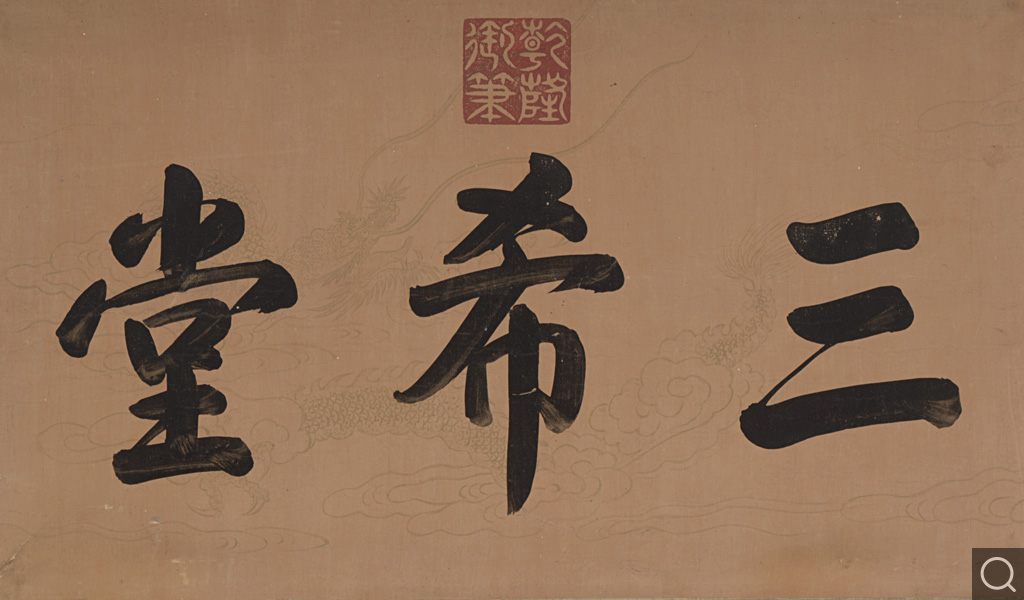 據(jù)匾后字條記載,此匾懸掛于三希堂“南床罩內(nèi)東墻上向西”。四周?chē)阅究?,于云龍紋地上墨筆書(shū)寫(xiě)“三希堂”三個(gè)大字,正中鈐“乾隆御筆”。用筆遒勁,結(jié)體秀媚,意趣飄逸。