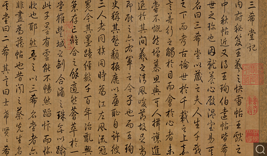本幅款署“乾隆丙寅春三月御筆”,鈐“乾”“隆”“幾暇臨池”。鑒藏印有 “石渠寶笈所藏”等。是卷外簽書“御筆三希堂記”。本幅書《三希堂記》,敘述三希堂命名緣由及意義。