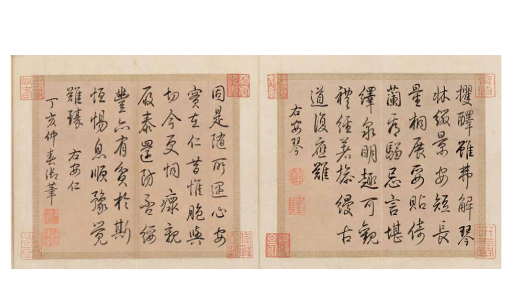 此冊配以上下夾板,其上金字隸書“御筆隨安室四詠”。本幅書《詠隨安室詩》四首,分別為安土、安窗、安琴、安仁。其后于敏中、董邦達、裘曰修、王際華、錢維城跋。