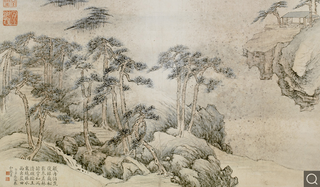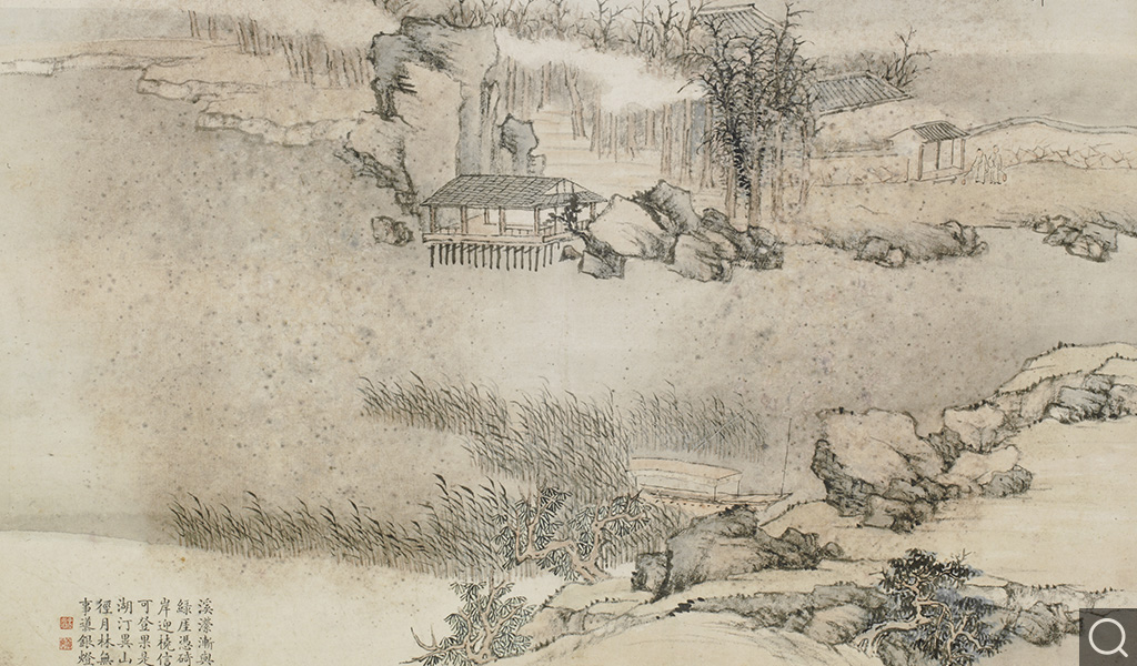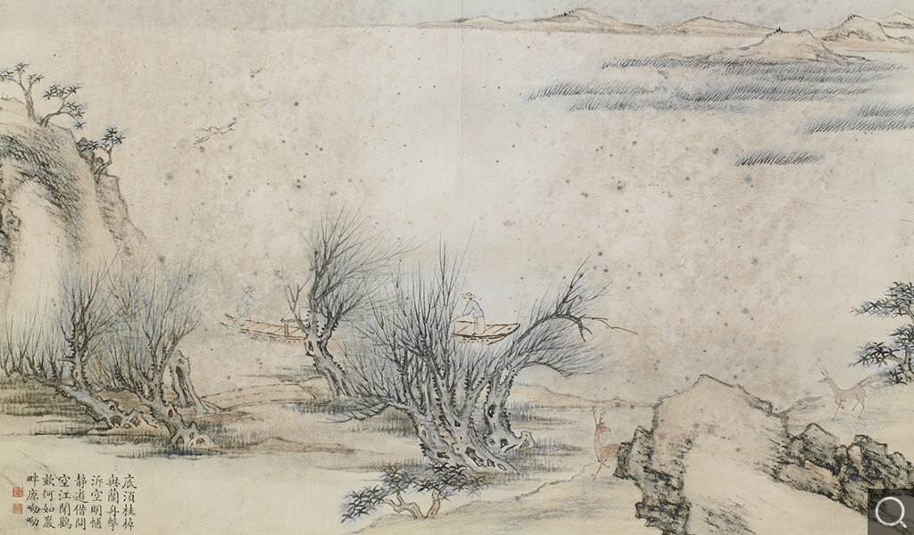 是幅永瑢筆端清逸雋秀,輕墨淡渲,卻不忘精細(xì)描繪避暑山莊的皇家景致。又因乾隆月夜游湖時(shí)以木蘭舟、桃花紙拈詠的講究而不離其詩(shī)意的細(xì)節(jié),如第七開《月舟》中所繪鶴、鹿來(lái)源于乾隆“自有鶴鳴與鹿呦”的詩(shī)句??梢娗〉鄣闹家庵苯佑绊懬鍍?nèi)府的藝術(shù)品位。