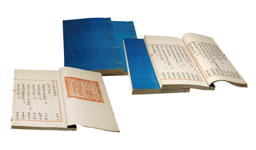 《石渠寶笈續編》正本之一。八十八冊二十二函。《石渠寶笈》初編完成后,歷經四十余年續藏,內府書畫更趨宏富。為寶典藏,以免舛偽錯失,乾隆帝命修《續編》。參加《續編》的人員有王杰、董誥、彭元瑞、金士松、沈初、瑚圖禮、玉保、吳省蘭、阮元和那彥成等十位,自乾隆五十六年(一七九一)開始修纂,兩年后成書。書中著錄歷代書畫作品有三千一百余種、四千三百余件(冊、卷、軸)。《續編》取消了“上等”“次等”之分,書首增列總目,以備點查。三朝宸翰已收錄《石渠寶笈》初編,其有石刻之未入者并舊拓善本專列“法帖”一門,敬錄于各類卷首,以補前編所未備。對畫作內容的描述也較《石渠寶笈》初編有所補充。其余則仍如《初編》 體例。當時曾奉命繕寫正本五部,分貯乾清宮、寧壽宮、圓明園、避暑山莊和盛京五處。此本鈐“御書房寶”宮殿璽,為該殿陳設本。二〇〇九年入選第二批《國家珍貴古籍名錄》。