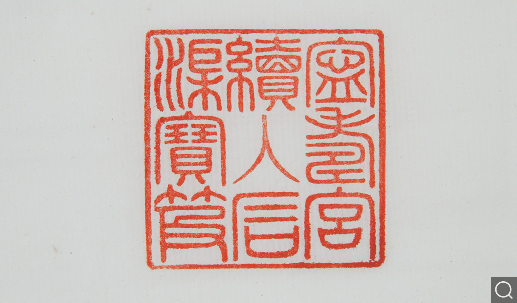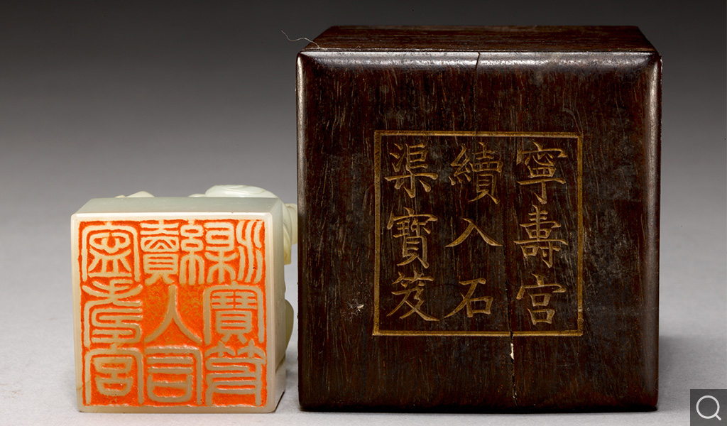 此璽置于紫檀木寶匣內,為《石渠寶笈續編》著錄之部分書畫作品上所鈐蓋的八璽之一,刻制于《續編》編纂期間。按《續編》凡例,凡收入《石渠寶笈續編》的古今臣工書畫,照例鈐“乾隆御覽之寶”“石渠寶笈”“乾隆鑒賞”“三希堂精鑒璽”“宜子孫”“石渠定鑒”“寶笈重編”各璽外,其分貯乾清宮、養心殿、重華宮、御書房、寧壽宮五處的書畫作品,需另加鈐五處鑒藏寶璽。因此凡寧壽宮所藏被收入《續編》者,都加鈐此方“寧壽宮續入石渠寶笈”璽。