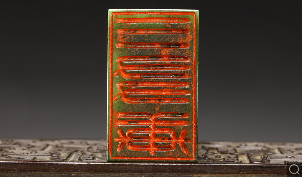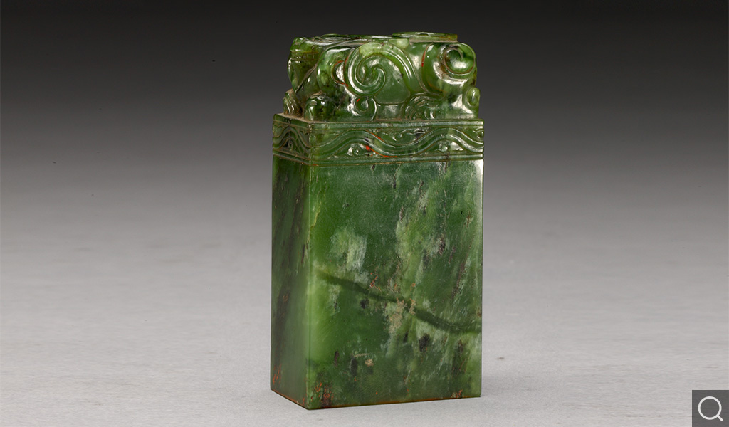 碧玉螭紐“三友軒”印長方形,陰文篆字。據《石渠寶笈》初編的編纂時間與《國朝宮史》可知建福宮中凝暉堂南室額曰“三友軒”。并據乾隆十二年(一七四七)所作《御制題三友軒詩》可知其由:“三友之名始宣尼,直諒多聞益徳資。香山取譬琴詩酒,放達繄非予所師。獨有玉局稱正見,直號植物松竹梅……”詩中“以松喻直,梅喻諒,竹喻多。”并種植松、梅、竹于三友軒窗前。在乾隆二十五年(一七六〇)再作《御制三友軒詩》,云:“詎惟笈里古香挹,更愛窗前生意含。”將內府所藏曹知白《十八公圖》、元人《君子林圖》、宋元人《梅花合卷》等古今名筆薈萃于一起,并命作檀匣合貯,匣上隸書“三友軒珍藏”五字。乾隆并御筆親繪《歲寒三友圖》等圖。